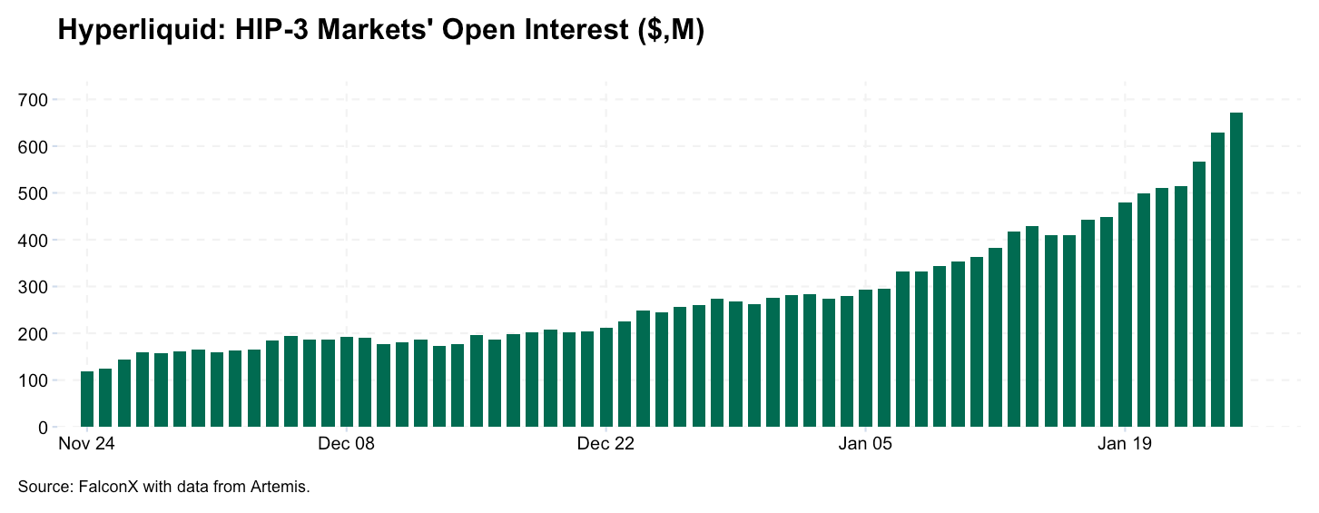 Along the line of perp-market activity, Hyperliquid’s HIP-3 markets are seeing a revival after volumes saw a lull into year end.