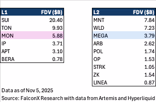 On the other hand, MEGA’s implied valuation would still place it amongst the top of its peerset, and would be the greatest FDV of a pure play L2 in the table below. Notably, the FDV compares to its recent token sale at a $1B FDV.