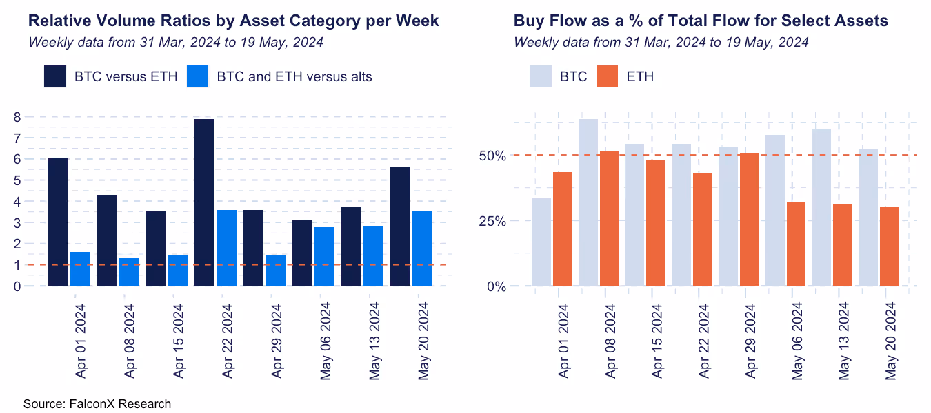 FalconX Trading Desk Color: The positive vibe shift made almost all client personas net buyers at the desk. Flow from prop desks and venture funds was particularly skewed to the buy side. ETH was the star of the show, as our BTC/ETH volume ratio dipped below 2x over the past few days for the first time since early March. Contrary to the past many weeks, in which 60-70% of our ETH flow was coming on the sell side, 75% came in as better buyers over the past few days. The increased interest in ETH and robust BTC activity drove our majors to alts volume ratio to more than 5x for the first time since mid-January. Within alts, we saw buy interest in SOL, ARB, DOGE, and SUI.
