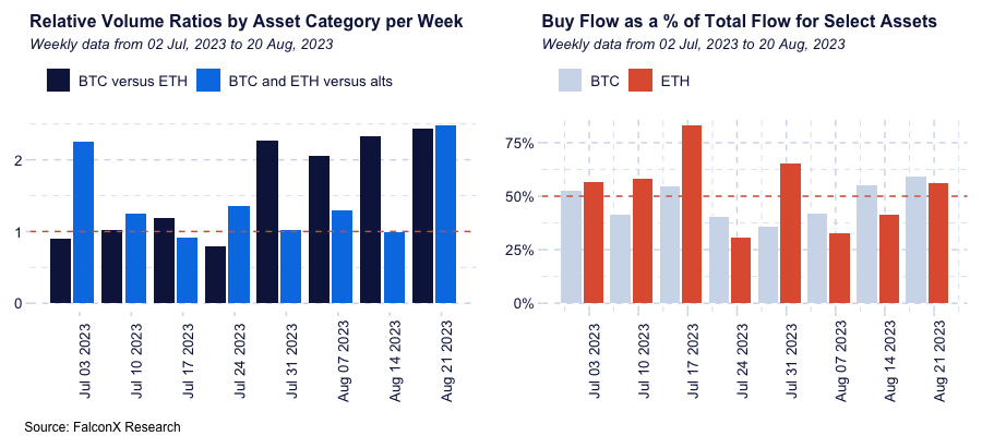 FalconX Trading Desk Color: BTC traded 2.4x more than ETH this past week, the highest ratio we’ve seen at our desks over the past three months. In general, our flow was net buyer over the past week, as we saw opportunistic buying during the most acute phase of the Thursday sell-off. Among majors, 59% of our BTC volume and 56% of our ETH volume came from the buy side. We saw relatively low interest outside of BTC and ETH, as the two majors traded 2.5x more than alts, the highest ratio over the past eight weeks. Our alts flow was very evenly distributed, except for some names (such as DOGE, BCH, and CRV), where we saw more predominant sell interest.