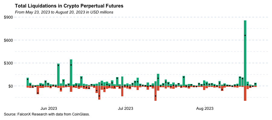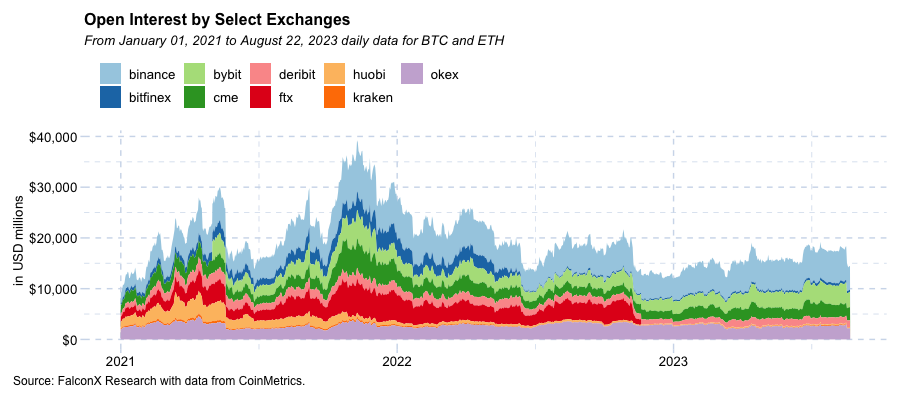 But more important than the initial spark, the market was primed for a pronounced correction. As we highlighted just last week, the build-up in open interest almost to pre-FTX levels amid multi-year lows in liquidity and trade hinted that a sharp reversal was on the horizon. Since last Thursday, open interest in BTC and ETH has reduced from $18 billion to $14 billion, which is in line with the levels before June but still slightly higher than the $12 billion lows for the year.