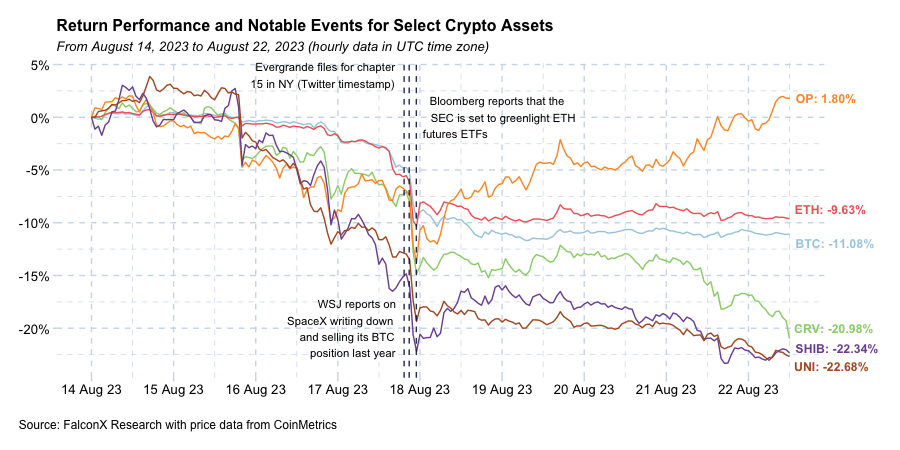 The week's positive highlight was OP, the only asset with a market capitalization above $1 billion that delivered a positive performance. That was because of its recent underperformance and because it continues gaining traction among Ethereum L2 solutions fueled by crypto social-fi app friend.tech (more on that below). On the other hand, CRV, SHIB, and UNI were among the larger assets that dived more than 20% during the turbulent week.