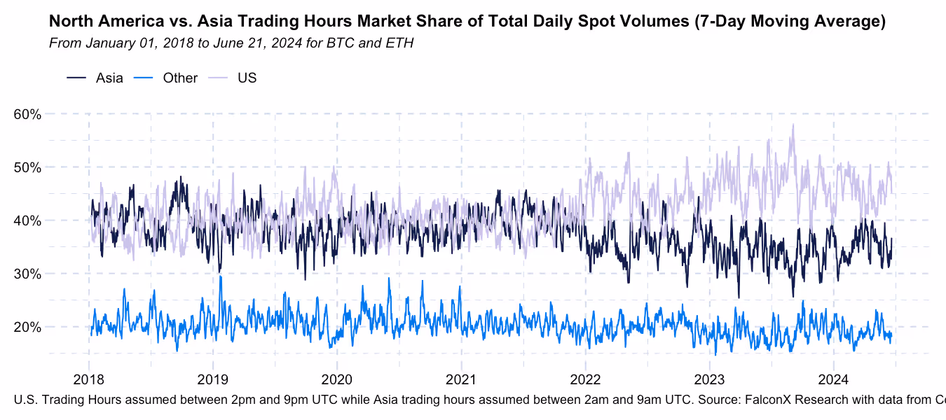 U.S. Flows Continue to Drive Price Action: The share of BTC and ETH spot volumes (seven-day moving average) during U.S. hours climbed back to the 45-50% level after reaching a 2024 low of below 40%. At the same time, volumes during Asian market hours retrenched to about 35% from 40% over the past few months. This trend highlights how, despite most of the crypto spot volume trading on international exchanges, the centrality of U.S. news flow has been driving most of the market price action.
